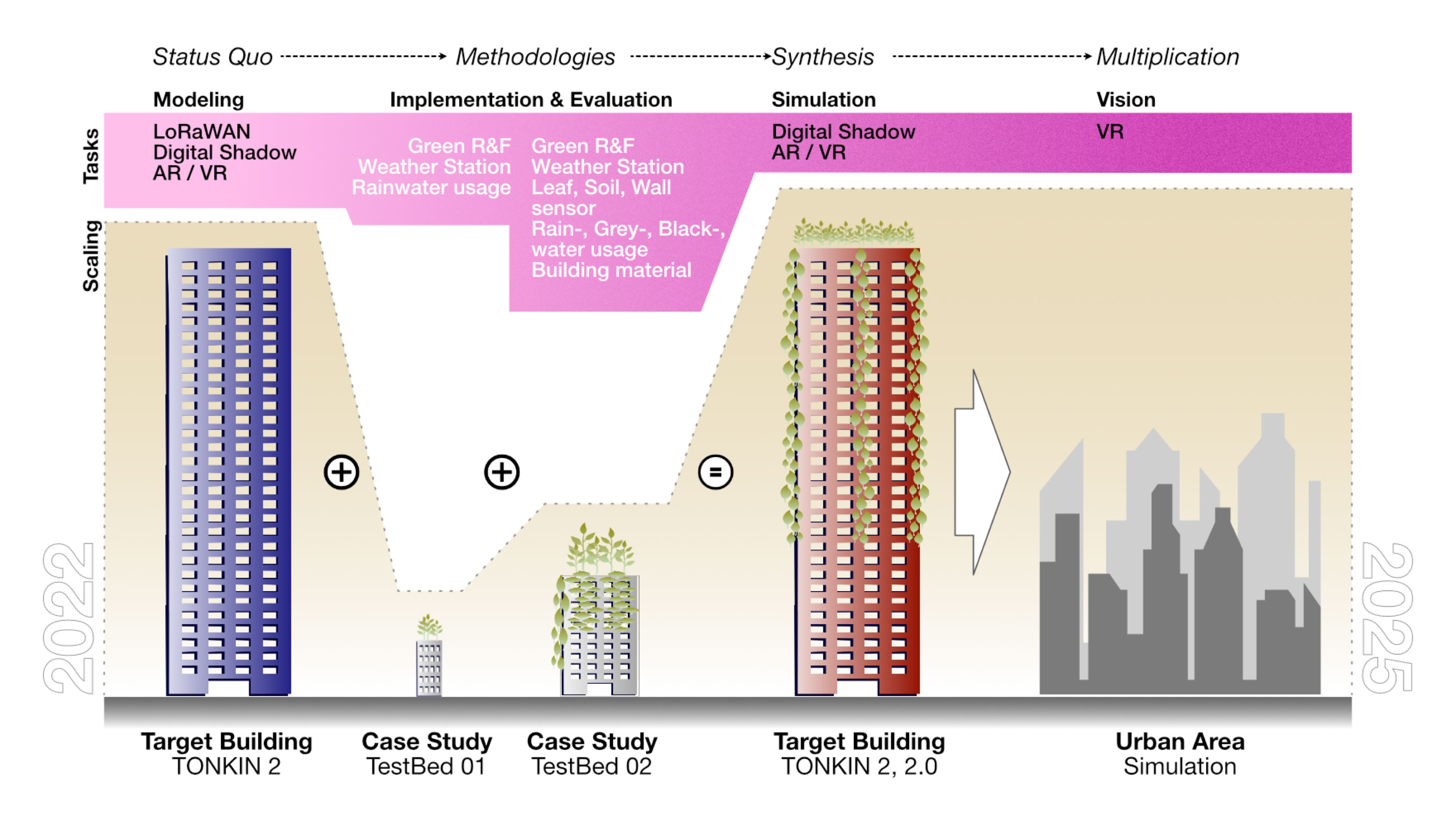 The schematic diagram below illustrates the scaling process over the course of the project. The project started with the big vision of Tonkin 2, scaled down sub-objectives of the project to a smaller building, TestBed 01, transferred the fully developed objectives to the TestBed 02 building based on the experience gained, and finally applied them again to Tonkin 2. The final results will be presented in a separate transfer model.